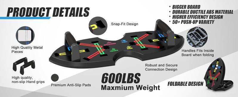 This push up board is easily to fold and carry on. It is not heavy but heavy duty because of the non-slip mat which comes with the box. And there is clear words on the board to target different muscle groups. You could getthe correct and efficient way for a full-body workout.